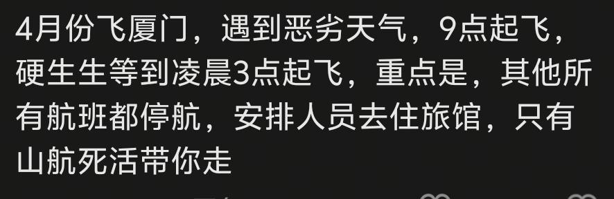 我有一次做山航飞首尔, 暴雨雷电其他航班都不飞了,山航一定要飞,在空中盘旋了两个小时没过去,直到没油了,下去加个油,继续飞,一定要当天送到。