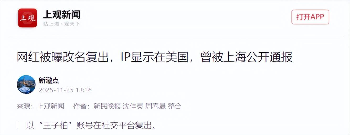 《网红被曝改名复出,IP显示在美国,曾被上海公开通报》——来源:上观新闻 作者:新民晚报 沈佳灵 周春晟 整合