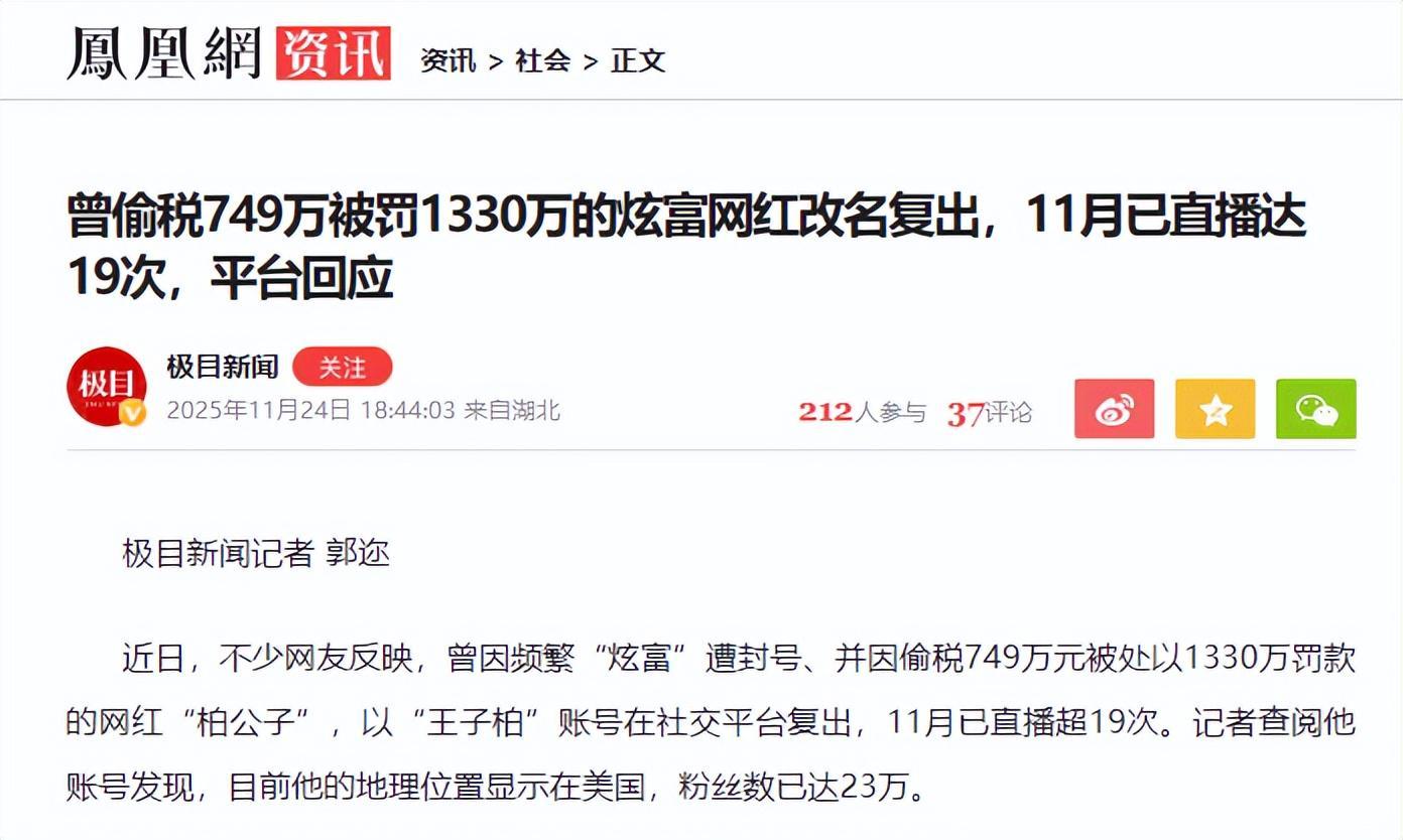 《曾偷税749万被罚1330万的炫富网红改名复出,11月已直播达19次,平台回应》——极目新闻记者 郭迩