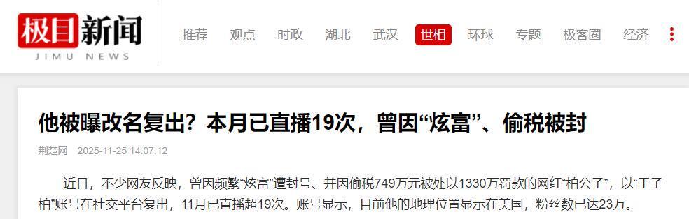 《他被曝改名复出?本月已直播19次,曾因“炫富”、偷税被封》——荆楚网 2025-11-25 14:07:12